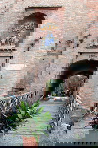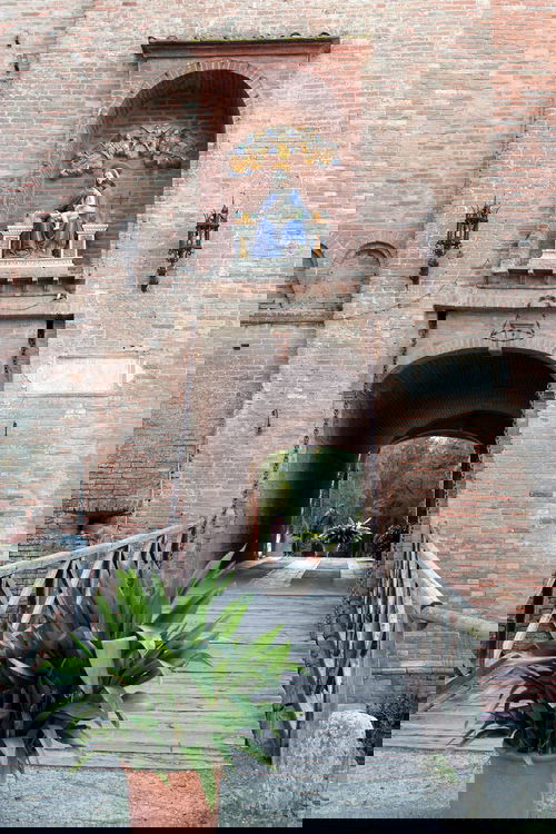 Dal parcheggio si entra all'Abbazia a piedi attraverso un ponte levatoio e un edificio medievale fortificato con una torre squadrata. Sopra l'entrata c'è una bella terracotta smaltata raffigurante la Madonna con il bambino attribuita alla famosa produzione della famiglia Della Robbia.