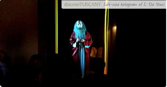 A sinistra della biglietteria troviamo invece la casa, composta da tre stanze: quella centrale dove si entra, mostra un vecchio camino, un tavolo di legno e una scultura con il volto di un Leonardo serioso dalla lunga barba che sembra fissare ogni visitatore. La stanza a destra raccoglie dei pannelli in italiano e inglese con la storia della casa. La stanza di sinistra invece ospita la novità principale di questo nuovo allestimento museale: l’ologramma a grandezza naturale di Leonardo da Vinci che vi accoglierà dall’angolo buio della sala raccondandovi la sua storia, quella della sua terra e della sua vita privata di cui sappiamo ben poco.