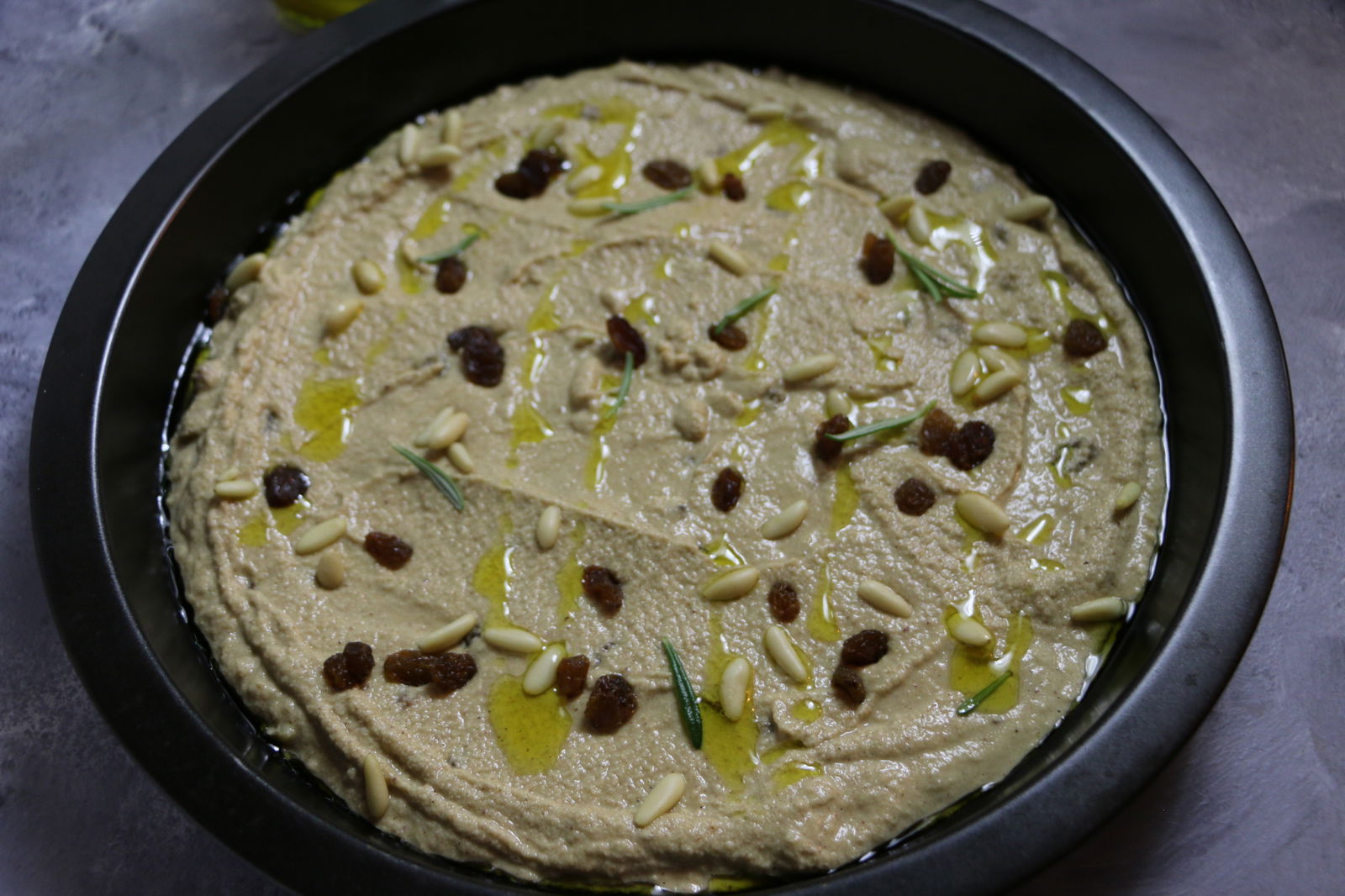 Aggiungi l'olio di oliva ed un pizzico di sale, l'uva passa ben strizzata (non aggiungere assolutamente l'acqua in cui l'hai messa in ammollo) e circa 2/3 dei pinoli, lasciando il resto per guarnire la torta.