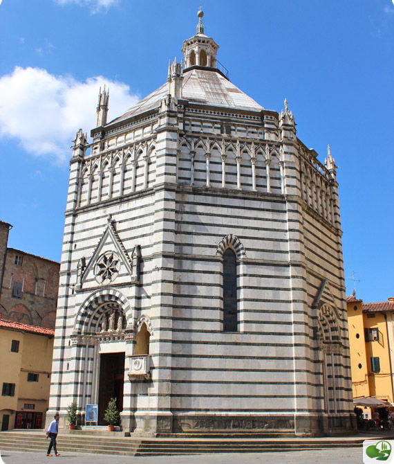 Di fronte alla Cattedrale troviamo l’antico Battistero di San Giovanni in Corte, un elegante esempio di architettura gotica risalente, nella sua forma attuale, al XIV secolo. Il Battistero ha pianta ottagonale ed una caratteristica facciata in marmo bicromo che si rifà alla tradizione romanica pistoiese.