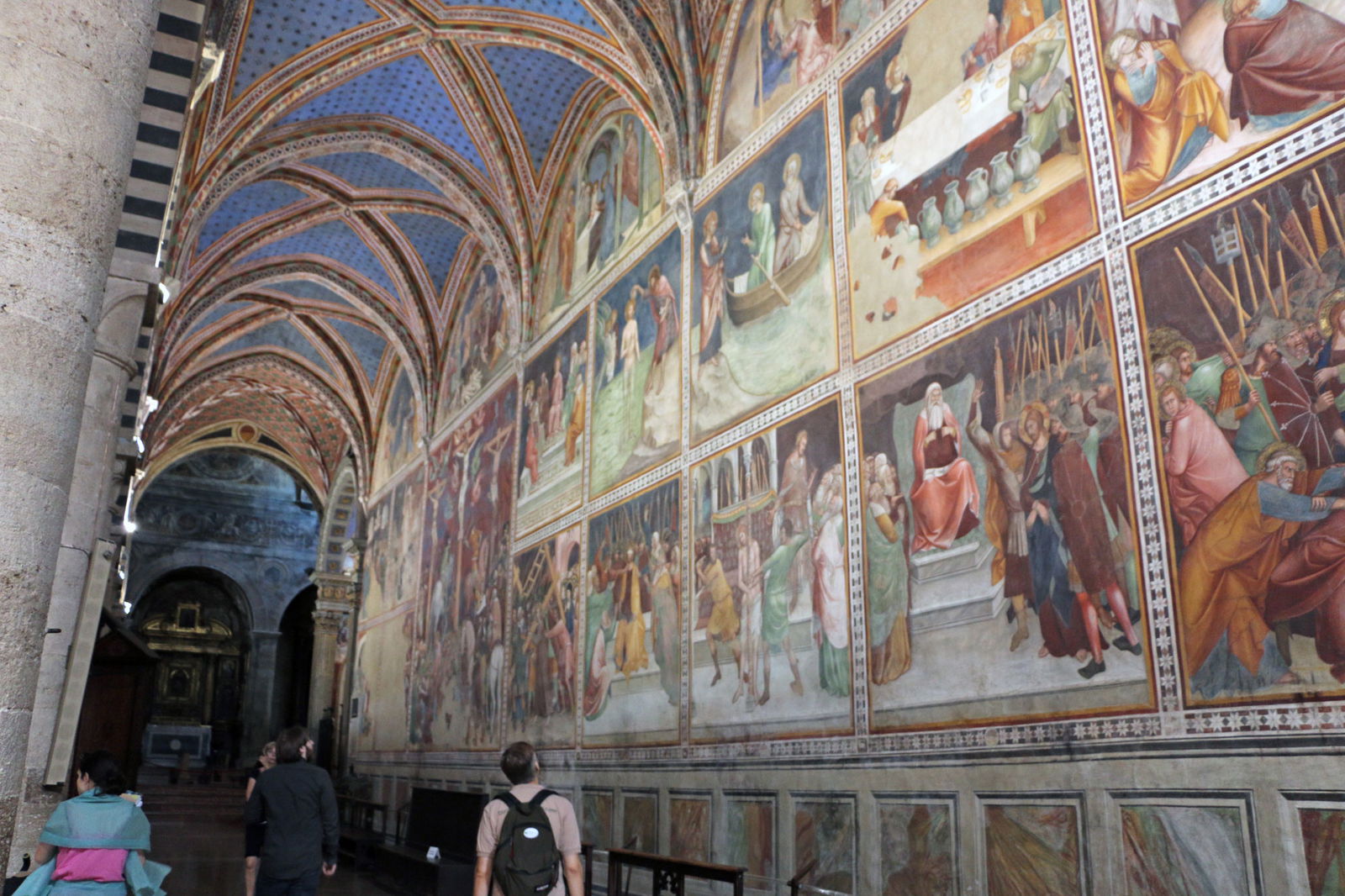 Tra i tesori che nasconde al suo interno, vi è l'affresco che ricopre interamente le pareti del Duomo e che non è MAI stato sottoposto a restauro durante i secoli. I colori sono quelli originali, dipinti nel 14° secolo, e la loro vivacità e brillantezza è semplicemente sbalorditiva. Sebbene alcune sezioni mostrino dei segni di usura dovuti all'inesorabile trascorrere del tempo, con qualche tassello mancante (ricordate che San Gimignano fu bombardata durante la Seconda Guerra Mondiale), per altre, invece, sembra che il tempo non sia mai passato o che siano state appena dipinte. Probabilmente questo dipende anche dal fatto che le finestre laterali furono chiuse durante la realizzazione dell'affresco, e la minor quantità di luce che penetrava all'interno ha permesso di limitare i danni. Gli affreschi sono stati solo rispolverati nel 1999, come parte del compenso che il regista Franco Zeffirelli ha pagato per poter usare il Duomo in alcune scene del celebre film Tè con Mussolini (che personalmente vi consiglio di vedere, se ancora non lo avete fatto).