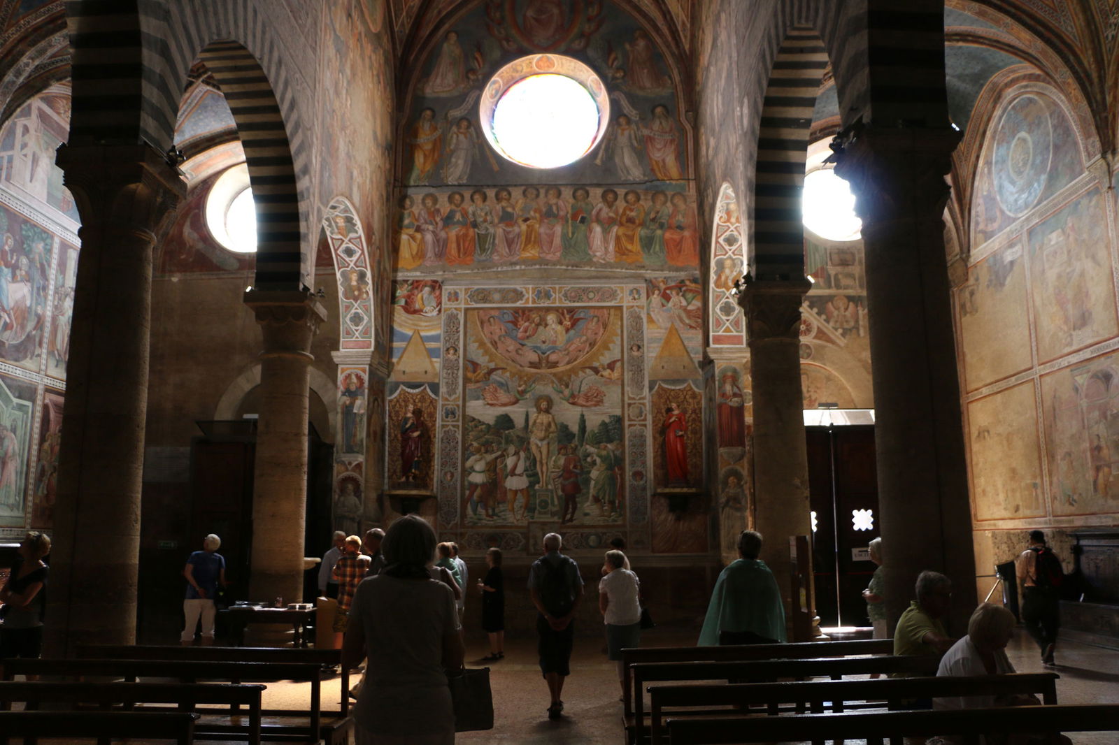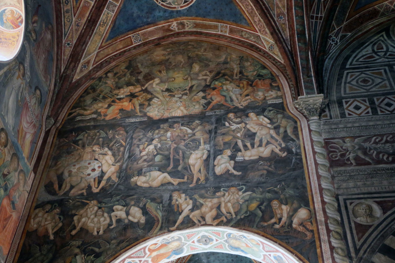 Dato che vi trovate qui, alzate lo sguardo verso gli archi che sovrastano ogni navata: vedrete rappresentate le due possibili opzioni dell'aldilà: sulla sinistra, la Gloria del Paradiso, con tutti coloro che sono stati consacrati al riposo eterno in Paradiso, e sulla destra, in direzione totalmente opposta - da un punto di vista sia geografico che semantico - Le Pene dell'Inferno, dove vedrete rappresentato Satana che mangia Giuda. Entrambe le rappresentazioni dell'aldilà sono opera di Taddeo di Bartolo, dal 1393 al 1403 circa. E' abbastanza evidente che quella dell'Inferno è un esplicito richiamo alla visione di Dante, dato che mostra i demoni che torturano i malcapitati per i loro innumerevoli peccati. Gli affresci, infatti, avevano lo scopo di educare i cittadini a comportarsi correttamente, proprio come se fossero dei libri del passato.