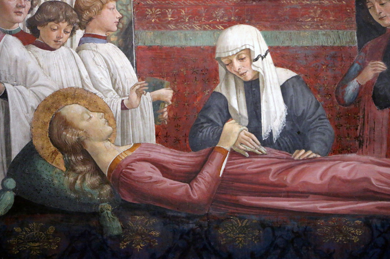 Sulla destra e dulla sinistra si trovano due affreschi di Domenico Ghirlandaio, un artista che personalmente... adoro!! Furono realizzati con l'aiuto di suo fratello David e di suo cognato Sebastiano Mainardi. Sulla destra, è rappresentata una giovane donna morente sul suo letto di legno, dove alcune violette gialle sono fiorite non appena è spirata e, sulla sinistra, il funerale di Santa Fina con il corteo al seguito a renderle omaggio, e la città di San Gimignano con le sue torri immortalate sullo sfondo.