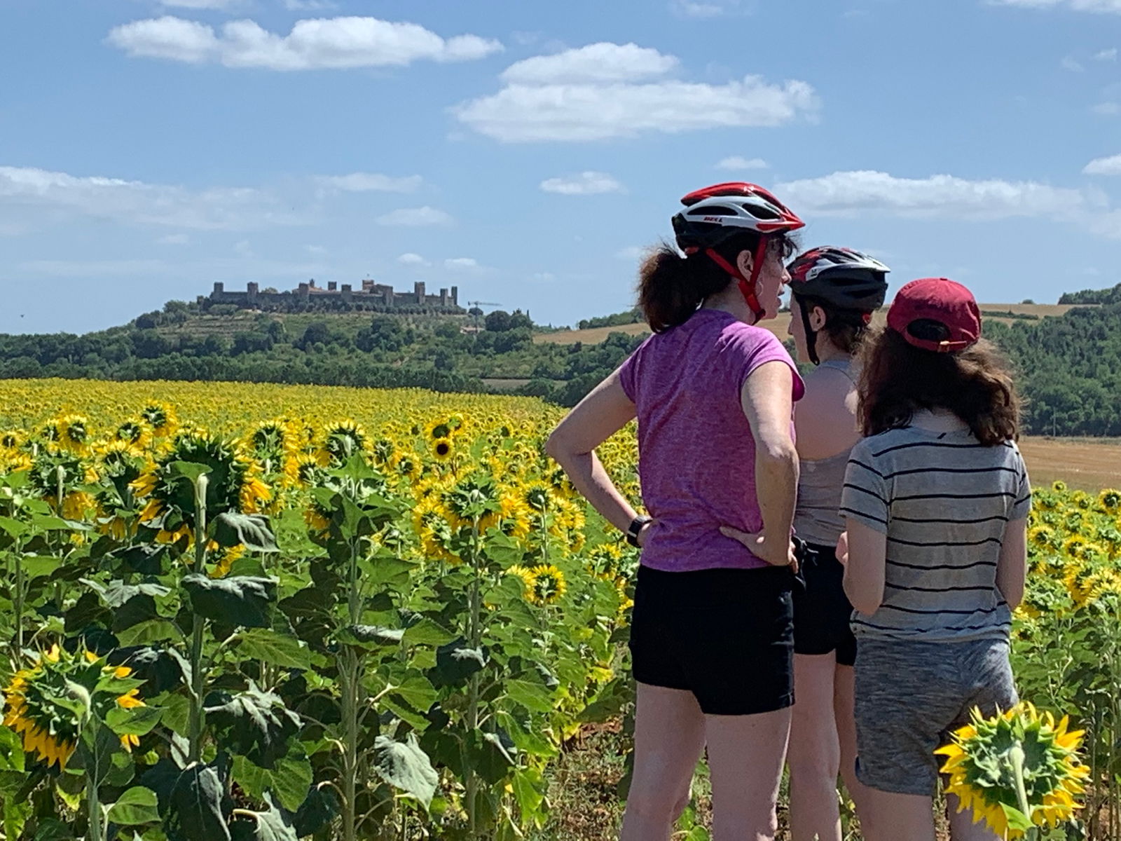 Abbiamo pedalato facendoci strada lungo i sentieri proprio come facevano gli antichi pellegrini durante il loro cammino sulla via Francigena. In certi casi, Piero si trasformava in un vigile che dirigeva il traffico, in modo da farci attraversare in modo sicuro qualsiasi luogo; spostandoci lungo le tradizionali "strade sterrate" e, attraversando una collina coperta di oliveti, abbiamo raggiunto Monteriggioni, dove abbiamo avuto l'opportunità di esplorare il centro di questo caratteristico borgo, alcuni con un gelato in mano.