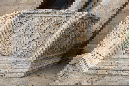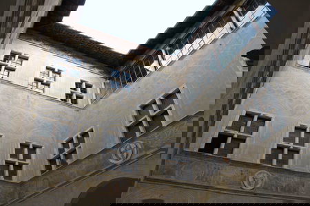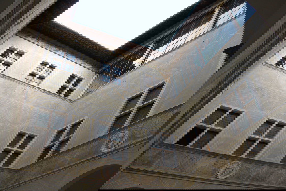Il palazzo, finemente cesellato in pietra, è di forma quadrata. Ogni piano è composto da due file di 23 finestre equidistanti, con una cornice ornamentale situata al di sotto delle finestre e a cornice del palazzo. Il grande portone si apre su un bellissimo cortile quadrato, circondato da un portico che offre riparo dal brutto tempo. L’edificio è stato progettato per offrire riparo sia dal caldo che dal freddo eccessivo, rendendolo perfetto per venire in contro alle esigenze dell'uomo. Ogni singolo elemento è armonioso e funzionale, oltre che essere meraviglioso, esteticamente parlando. Se vedete questi elementi in qualsiasi altro palazzo rinascimentale, ricordate che sono stati inventati qui!