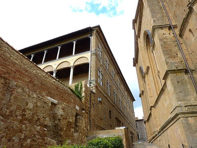 Palazzo Piccolomini è uno degli elementi architettonici principali di Pienza, costruito secondo il progetto umanista di realizzare la città ideale di Enea Silvio Piccolomini, Papa Pio II.