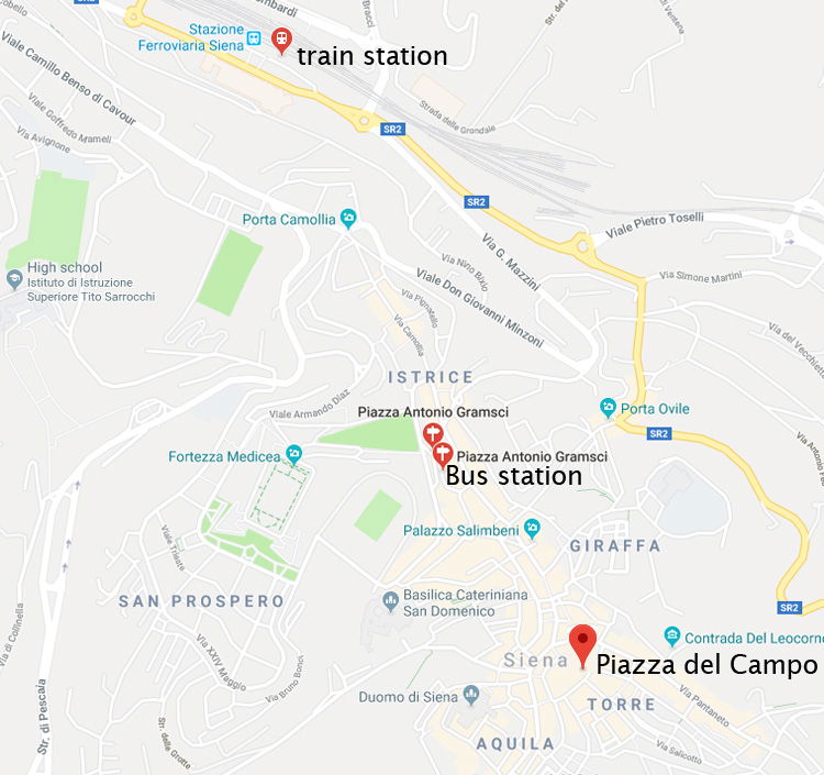 Check out the map below to see the relative distances between Piazza del Campo (where you want to go) to where the bus and train stations are.