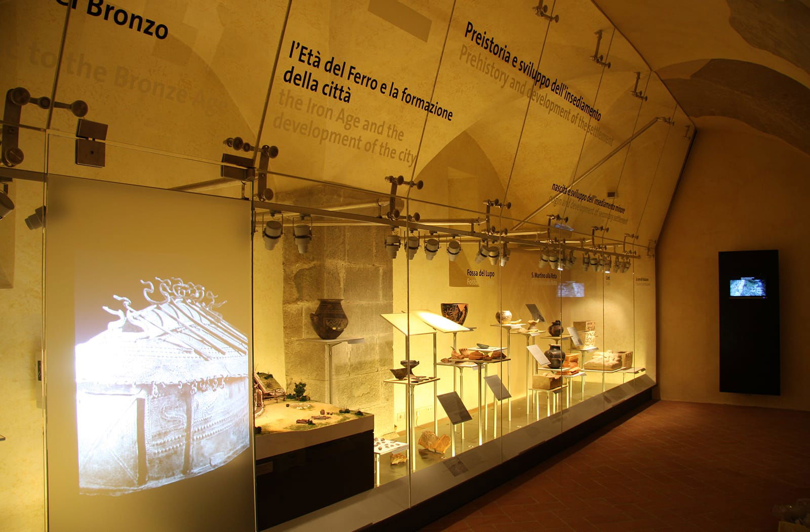 The first two rooms introduce visitors to prehistorical times in the Chiana valley (Valdichiana) with the remains of prehistorical animals discovered in 1960 in the area near Farneta. During the archaeological dig, large mammal fossils were also discovered, including platforms of Megaceroides obscurus, fragments of hippopotamus and a pair of large molars of Mammuthus meridionalis which are now conserved in the museum. The remains of a 4 meters tall elephant are instead found at the Archaeological Museum in Florence.