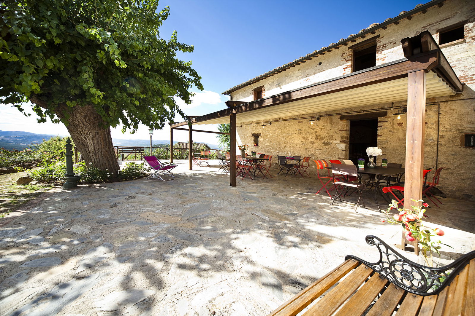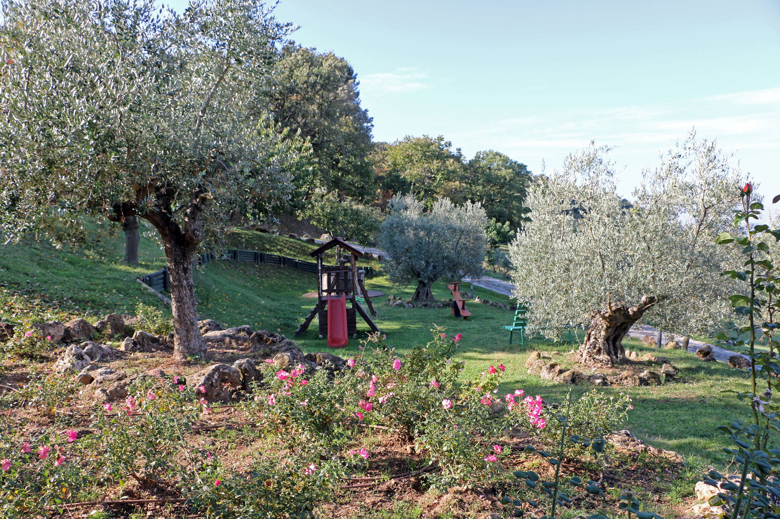 I vari edifici in pietra che compongono il borgo - dalla casa padronale alle stalle fino al frantoio - sono stati trasformati in appartamenti di varie dimensioni e una villa circondata da ulivi e boschi. Tutti gli appartamenti sono in stile toscano originale, con pavimenti in cotto e soffitti con travi in legno, hanno il proprio ingresso indipendente, il giardino privato e la cucina attrezzata, che consente di organizzare i propri pasti a piacimento. Gli ospiti condividono una bella terrazza panoramica con tavoli e sedie e una piscina a sfioro, entrambe con una vista incredibile sulla campagna circostante, tavoli da picnic all'ombra dei boschi, un ampio parco giochi e un'area da bowling coperta.