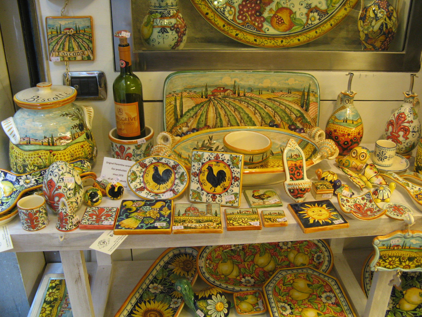 La ceramica, come il vino, è molto delicata da trasportare, ma se cerchi il regalo perfetto che possa durare una vita, ricordo dei momenti bellissimi vissuti in Toscana - o il souvenir da regalare per un'occasione speciale ad amici o parenti - hai trovato quello che fa per te! Per esempio, un vassoio, un set da tè o caffè, o un'intera collezione da tavola: si tratta di investimenti, è vero, ma tieni presente che dureranno una vita e che sono di altissima qualità. I negozi e gli artigiani che ho incontrato fino ad ora si sono rivelati sempre felici di collaborare con chi acquista per creare degli oggetti unici: molti, infatti, sono disponibili a disegnare qualcosa di speciale per te e solo per te, su commissione, prendendosi cura di spedirtelo anche a casa una volta pronto.