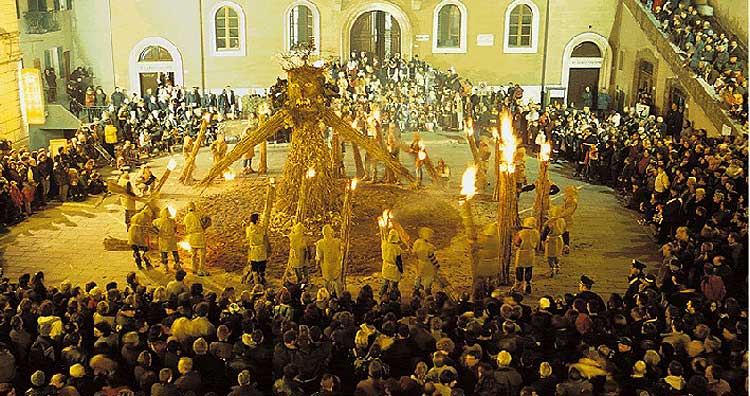 Vieni a vedere la città che si riunisce per costruire un magnifico ed impressionante falò ed annunciare, così, l'arrivo della primavera. Questo rituale pagano è ritenuto essere una sorta di purificazione della terra e preparazione per i nuovi semi che verranno piantati con l'arrivo della bella stagione; negli anni, è stato trasformato in un festival in onore di San Giuseppe, giornata meglio conosciuta come Festa del Babbo.