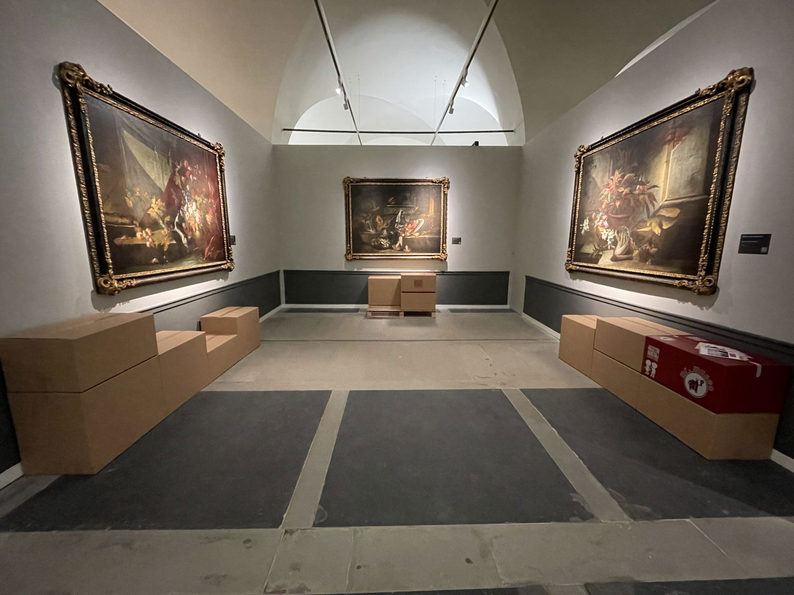 Originale e degno di un deposito, anche l’allestimento: le opere sono piazzate sopra o vicino a scatole di cartone sulle quali si troveranno didascalie e focus di approfondimento.