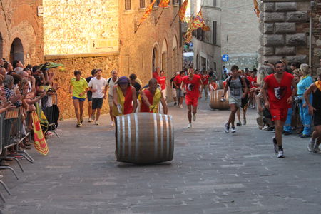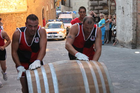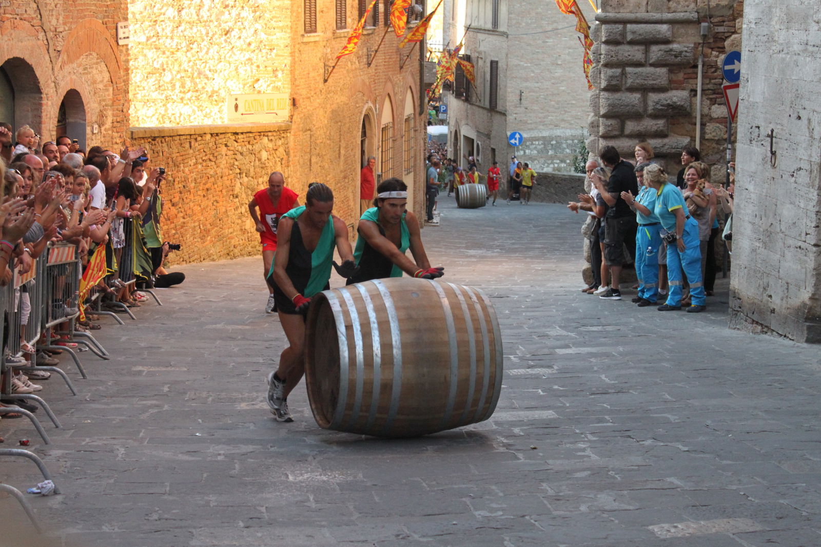 La competizione è molto impegnativa e ti lascierà letteralmente col fiato sospeso; gli sfidanti di ciascuna contrada devono spingere e far rotolare enormi e pesanti botti di legno per circa un kilometro in salita attraverso le viuzze del centro storico. Ciascuna botte viene spinta da due forti "spingitori" fino al traguardo, proprio di fronte al bellissimo Duomo in Piazza Grande.