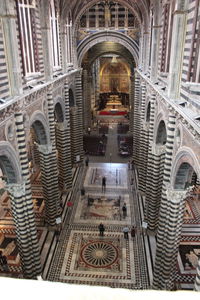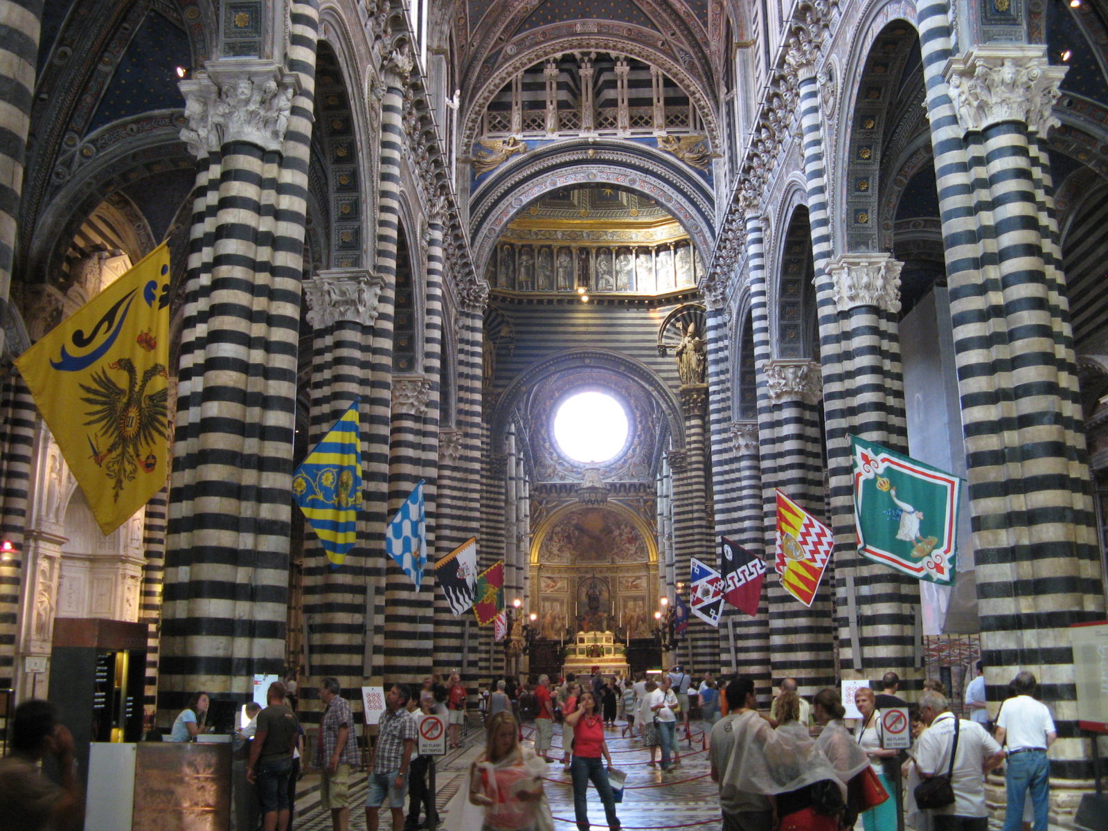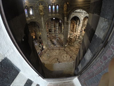 Se ti capita di visitare il Duomo di Firenze e successivamente la Cattedrale di Siena rimarrai sorprendentemente impressionato da quest’ultima, non che il Duomo di Firenze sia da meno, la sua cupola è immensa e ineguagliabile cosi’ come la sua parte esterna ma i suoi interni sono pressochè spartani in confronto. A Siena non basteranno due soli occhi per scoprire tutte le bellezze contenute al suo interno. Le colonne mantengono il motivo del marmo bianco/nero alternato dell’esterno, alzando la testa noterai busti di uomini religiosi senesi vissuti in passato che sembrano fissarti. Ti consiglio di prestare particolare attenzione al pavimento: le più impressionanti opere d’arte della cattedrale si trovano qui, capolavori che narrano storie realizzati come enormi puzzle.
