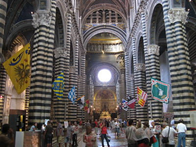 Costruita tra 1214 e il 1263, presenta una struttura a croce latina, una cupola non molto sporgente con il campanile accanto. Sia l’esterno che l’interno sono decorati in blocchi di marmo bianco a cui sono alternate più sottili strisce nere verdastre, sono questi i colori rappresentativi di Siena.