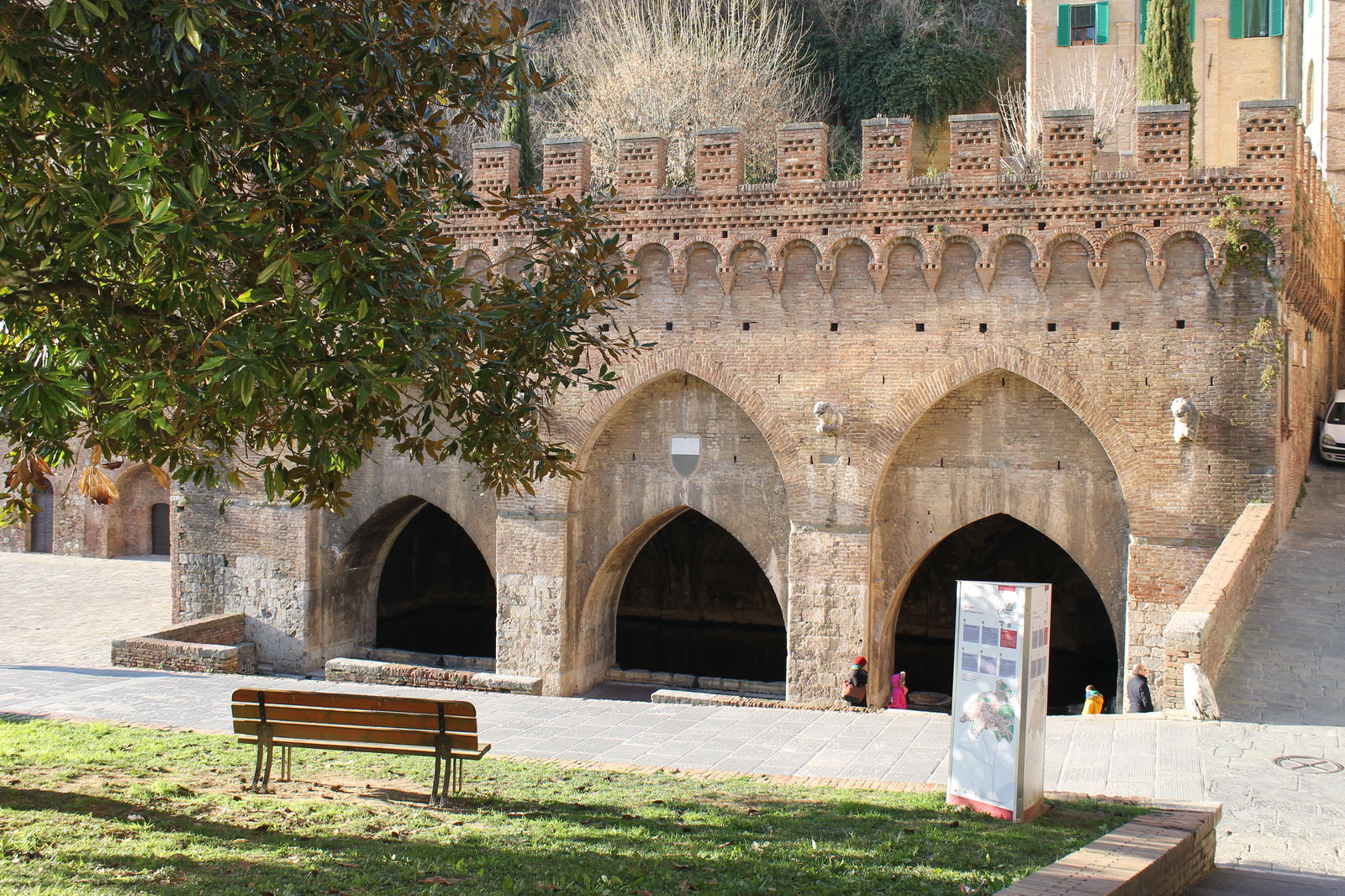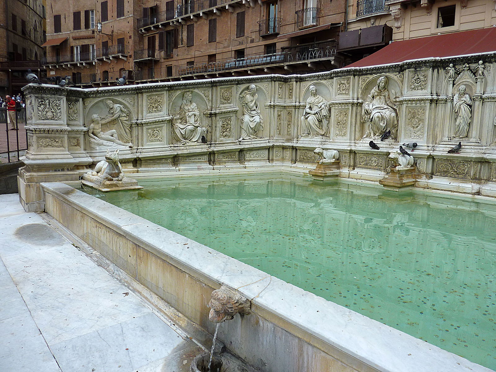 Non c'è luogo migliore per iniziare a esplorare le fonti di Siena che Fonte Gaia nel pieno cuore della città in Piazza del Campo. La gioia dei cittadini che testimoniavano per la prima volta l'arrivo dell'acqua in piazza nel 1346 ha dato questo nome alla fonte pubblica più importante della città. Per far accadere questo, era stata realizzata una grande opera idraulica con una lunga galleria per portare l'acqua fino a questo sito abbastanza elevato della città. All'inizio del secolo successivo, completato nel 1419, la fonte venne decorata con le sculture di un importante maestro del Rinascimento senese Japopo della Quercia. Le sculture che si possono ammirare oggi sono tuttavia copie realizzate nel 19° secolo, dato che le originali nel tempo si erano danneggiate e oggi conservate nel Museo di Santa Maria della Scala.