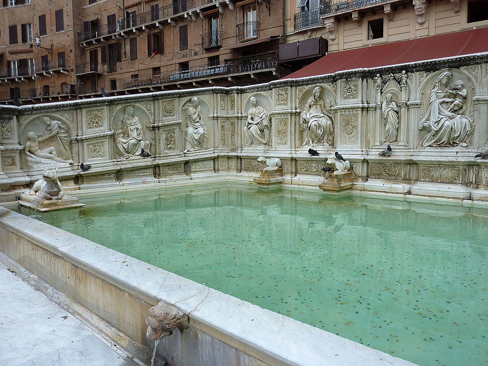Situata in posizione opposta a Palazzo Pubblico ed alla Torre del Mangia, Fonte Gaia rappresentava l'orgoglio e la gioia di Siena, costruita nel 1346. Le suggestive incisioni in marmo che si vedono oggi sono copie restituite da Tito Sarrocchi delle originali commissionate a Jacopo della Quercia nel 1409. Le sculture originali ed i basso-rilievi sono visibili al museo dello Spedale di Santa Maria della Scala. Alimentata da tunnel sotterranei che si estendono per oltre 30 km, fornisce la quantità di acqua necessaria al centro storico.