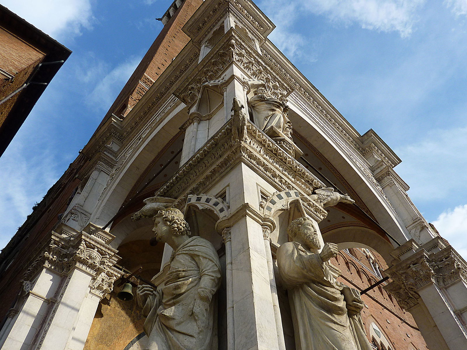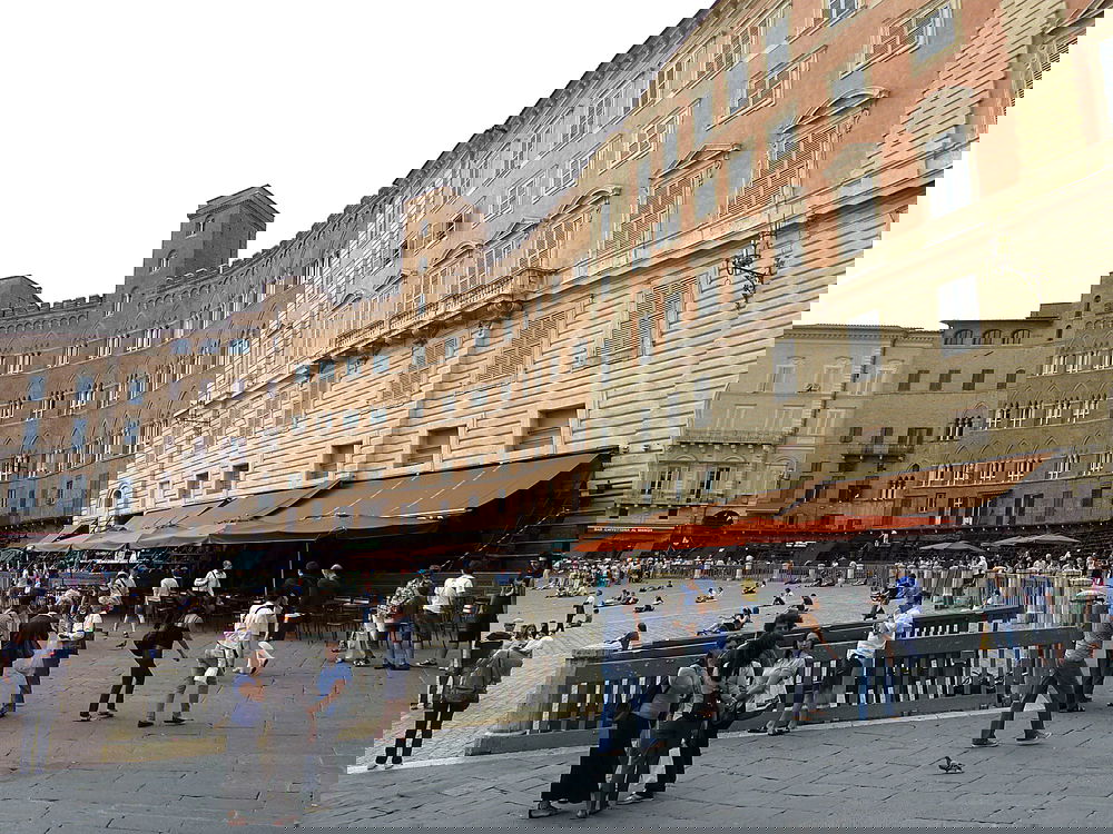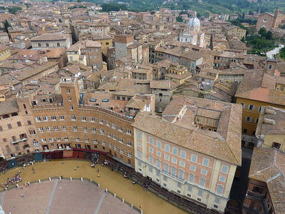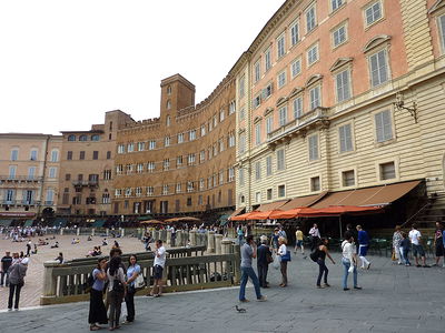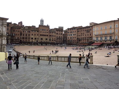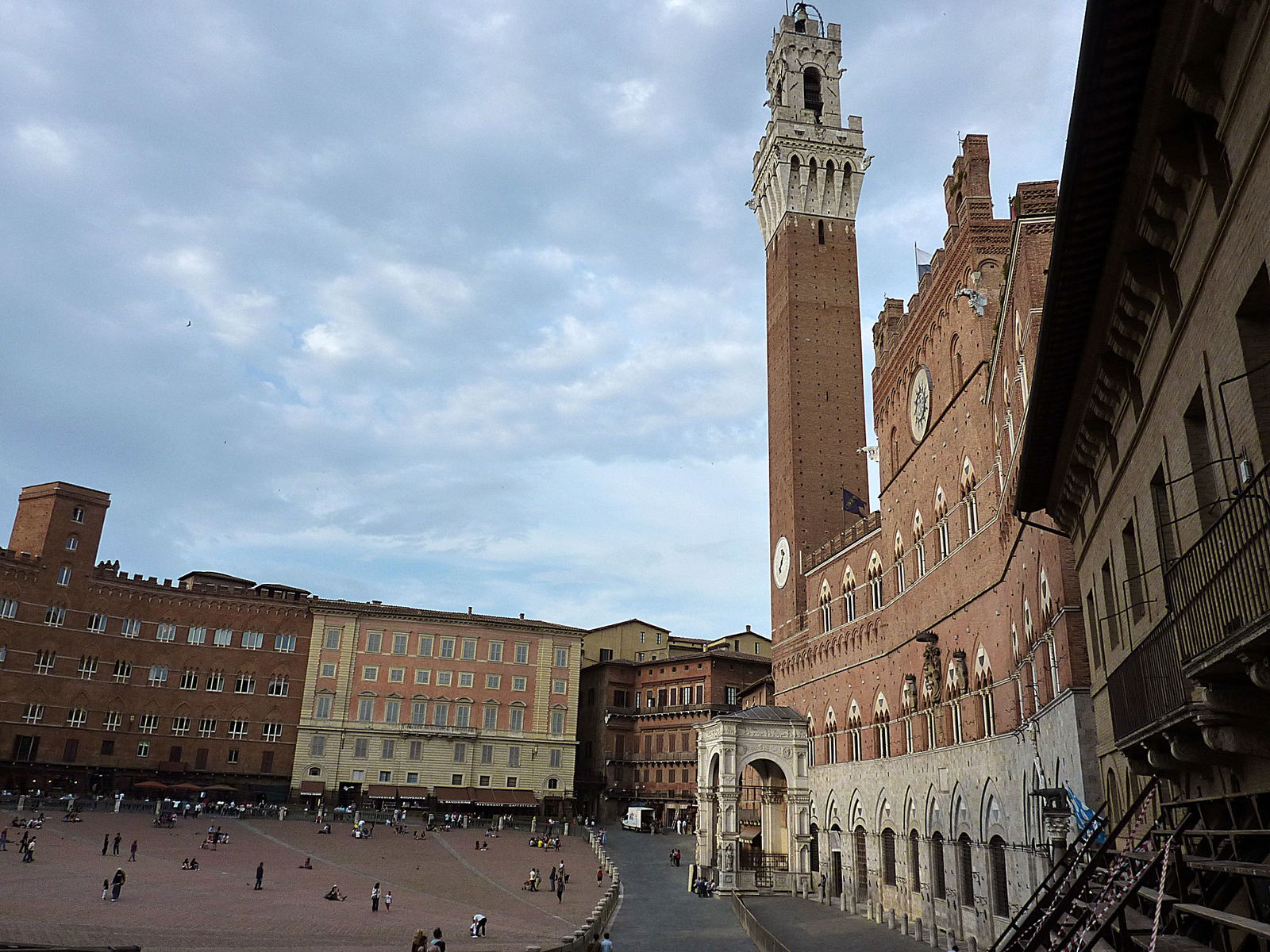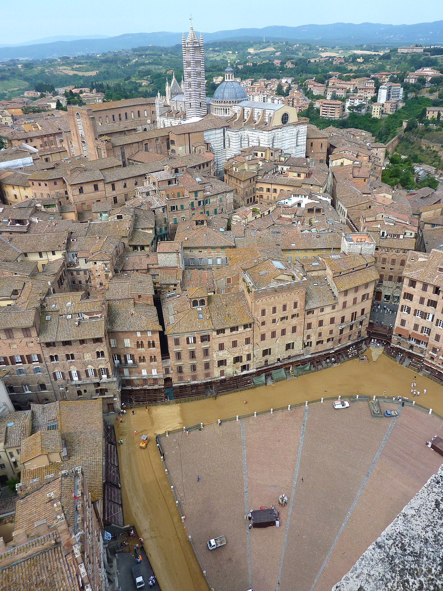 Un tempo, Siena aveva le stesse dimensioni di Parigi, sebbene dopo la devastazione della peste la popolazione diminuì drasticamente senza mai riuscire a riportare la città al suo glorioso passato, persino oggi. Piazza del Campo era stata concepita come un'area dove l'intera cittadinanza potesse incontrarsi per dar luogo ad attività varie, giochi, eventi politici - motivo per cui fu costruita delle dimensioni adatte ad ospitare l'intera città. Non vi sono documenti che attestino che tutte le strade dovessero condurre alla piazza (e, di conseguenza, a Palazzo Pubblico) ma, quando si attraversano almeno 4 dei sette varchi che permettono di entrare nella piazza, l'occhio sembra quasi dirigersi in maniera automatica all'edificio civico - mentre i restanti tre offrono una veduta panoramica della Torre.