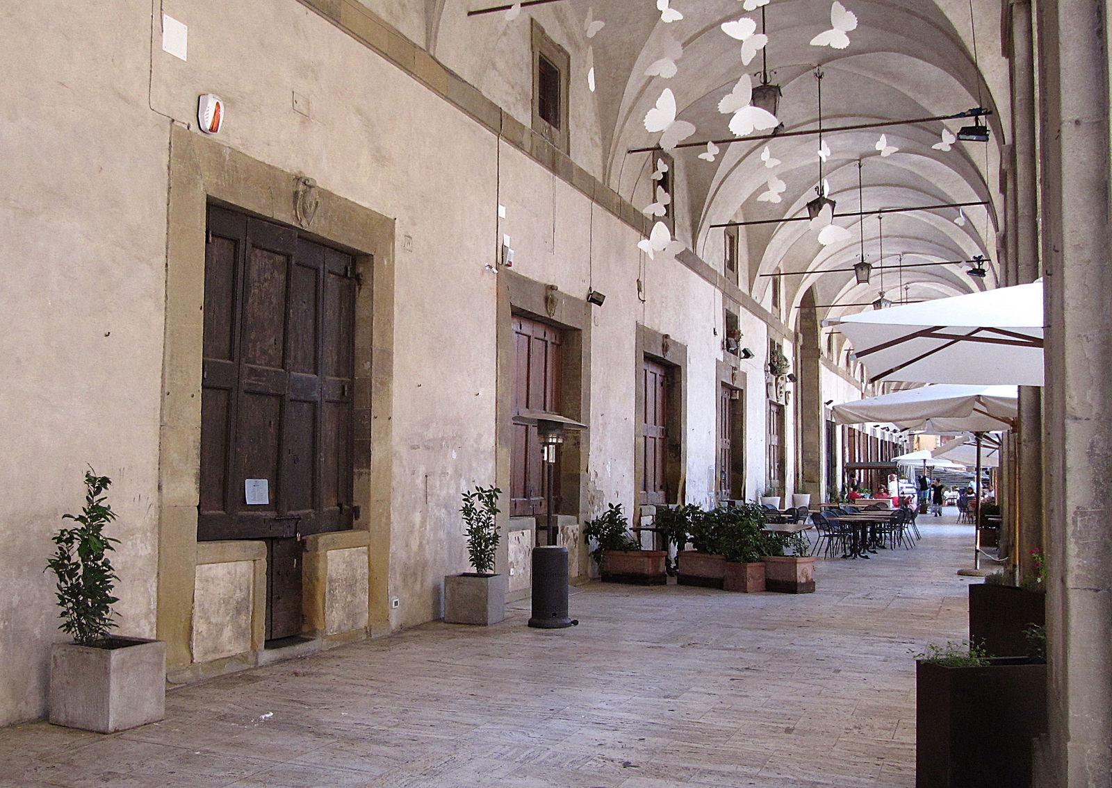Down this road (Corso Italia) to the left, you will find the Loggia designed by Vasari, with its lofty arches and antique doors to what were once the stores and shops that lined the square. This area now hosts several little cafés and restaurants, in the summer and spring they spill out onto the loggia and in the winter they feature cozy little places which offer a panorama over the Piazza Grande.