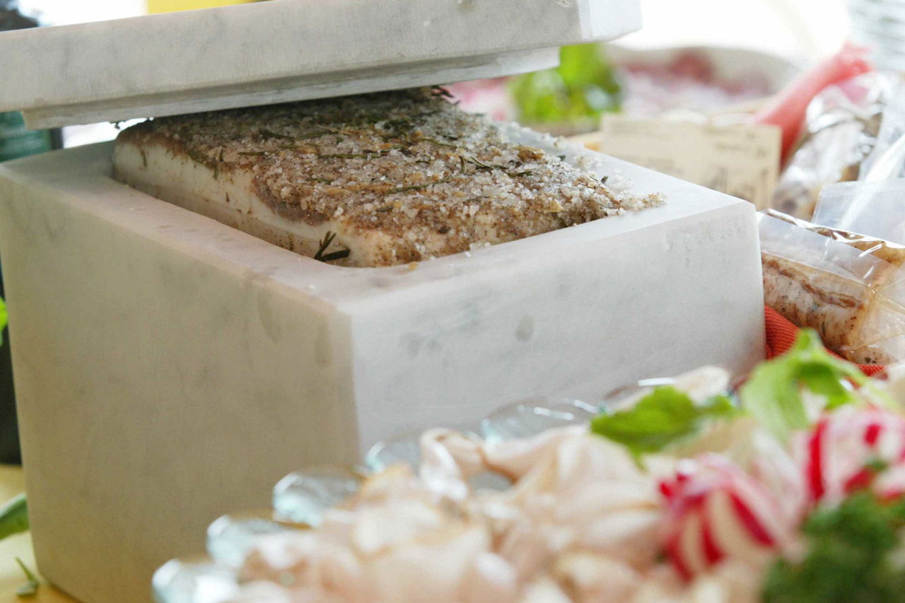 Made from pork belly fat (at least 3 cm thick), it is be sprinkled with sea salt, fresh rosemary and ground black pepper before placing the lard in a sealed marble container with a lid - called "conches" - which has been previously rubbed with cloves of garlic.