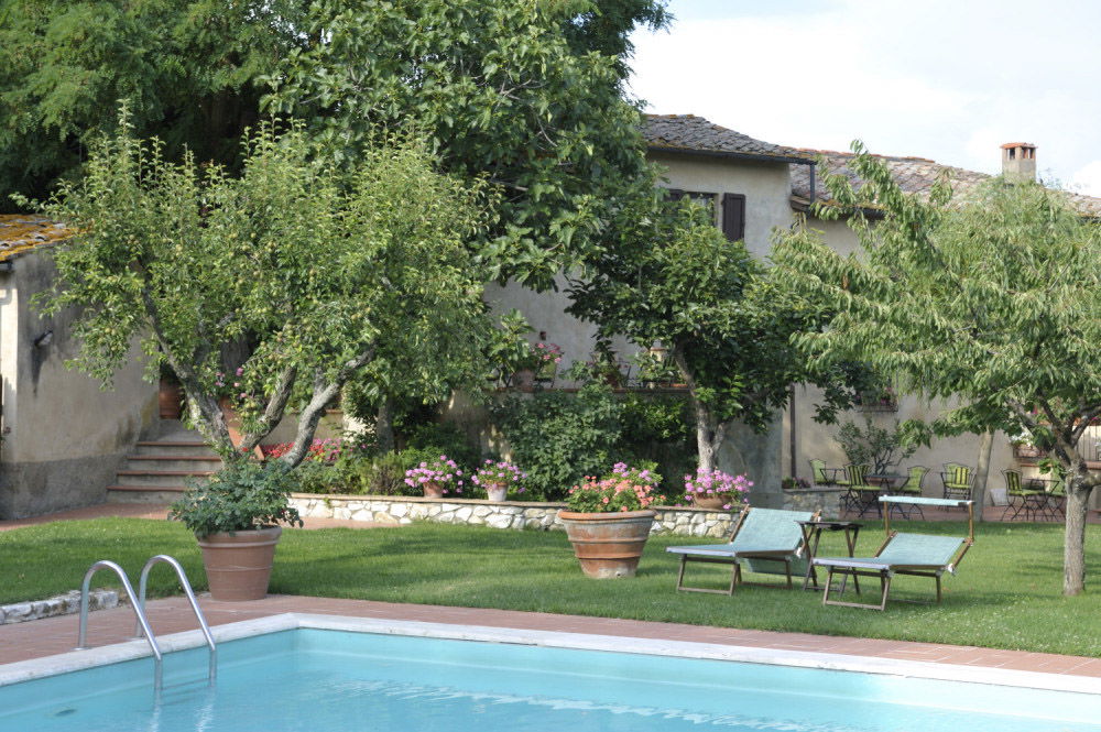 The traditional Tuscan farmhouse Il Casolare di Libbiano greets you with the sweet fragrance of home, and the whisper of pure relaxation and tranquility calls you to venture within the gardens. The B&B style rooms, with charming views over the San Gimignano landscape were attentively designed by Andrea and Berta, the owners, to embrace their guest in a warm Tuscan hug. The fenced in garden and lovely pool complete and the surrounding buildings, with their warm colored sandstone walls are pure delight.