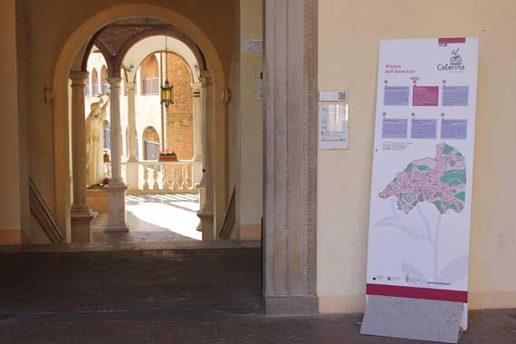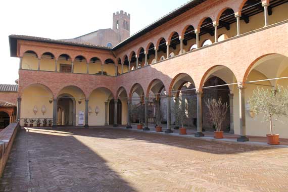 From Basilica of St Domenico take Via della Sapienza and then turn right into a steep downhill where about halfway down you can find in the home-sanctuary of Catherine constructed in the place where the Benincasa family once lived. The cult of Catherine grew quickly after her death and especially after Sienese Pope Pio II canonized her in 1461. The entrance portico of the Municipalities of Italy was constructed after 1939 when Catherine was proclaimed patron Saint of Italy. In the museum, with free entrance, you can admire the beautiful ceramic floor in the Oratory of the Kitchen, once part of the house, and many frescos depicting episodes from the Saint's life. Downstairs is a small room where Catherine used to rest on a stone pillow and in the Church of the Crucifix there is a 12th century crucifix from Pisa, which was supposed to have given the stigmata to the Saint.
