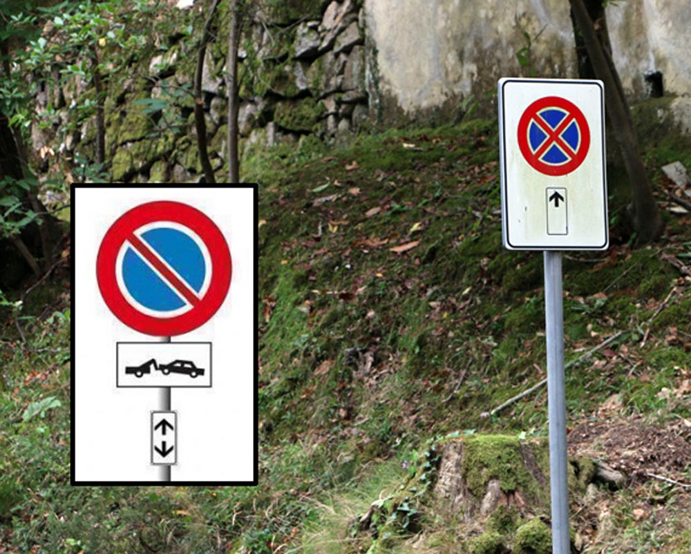 The "no parking" signs to be wary of: the one with car being towed is definitely more simple to read, but we definitely did not notice the one with just arrows (similar to the one on the right) in Bolgheri