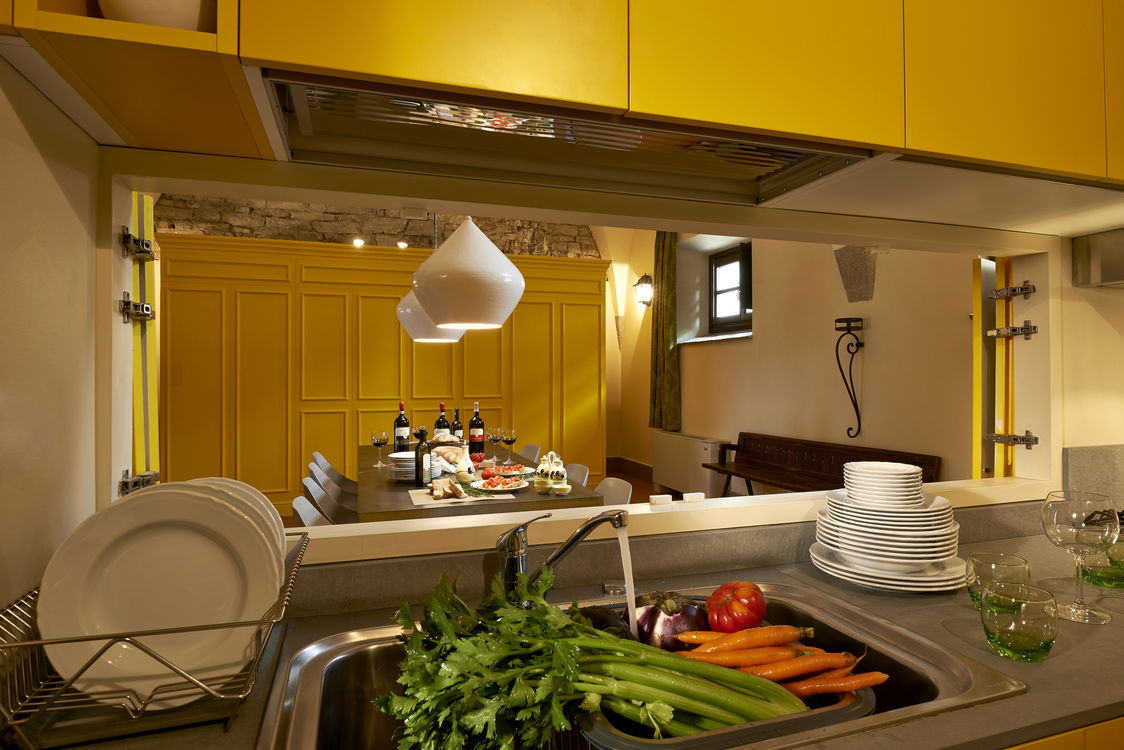 Every room in the holiday residence rentals brings together classical characteristics like terra-cotta floors, wrought iron bed stands, rich wooden furnishings and comfortable chaise lounges. Yet, at the same time you will find splashes of color in all the rooms: the snazzy black & white carpets, the sunshine yellow cabinets and the purple throw pillows in the bedroom. The bathrooms are extra-large with wall-to-wall mirrors, complimentary soaps & lotions from the Florence shop Aquaflor, double showers and romantic claw-foot tubs. Just the right touch for a romantic vacation in Tuscany.