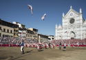 Fabulous fireworks along the Arno conclude Florence's celebrations to St. John the Baptist, the city's patron saint, on June 24. First, there is a parade in historical costume that starts at the Church of Santa Maria Novella and ends at the Church of Santa Croce, where the Calcio Storico is then played in the dirt-covered square in front of the church. The game is a combination of soccer, rugby, and big time wrestling, all played while wearing 16th century costumes. The four teams represent the four traditional neighborhoods of the city: Santa Croce (blue), Santo Spirito (white), Santa Maria Novella (red), and San Giovanni (green). The prize is a whole Chianina calf.