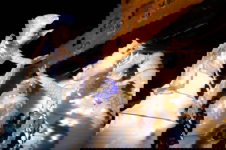 At the same time fantastic creatures wandered along the streets and people were invited to enter the fabulous world of dreams following the "Baracca dei Buffoni”, artists walking on stilts dressed like clouds.