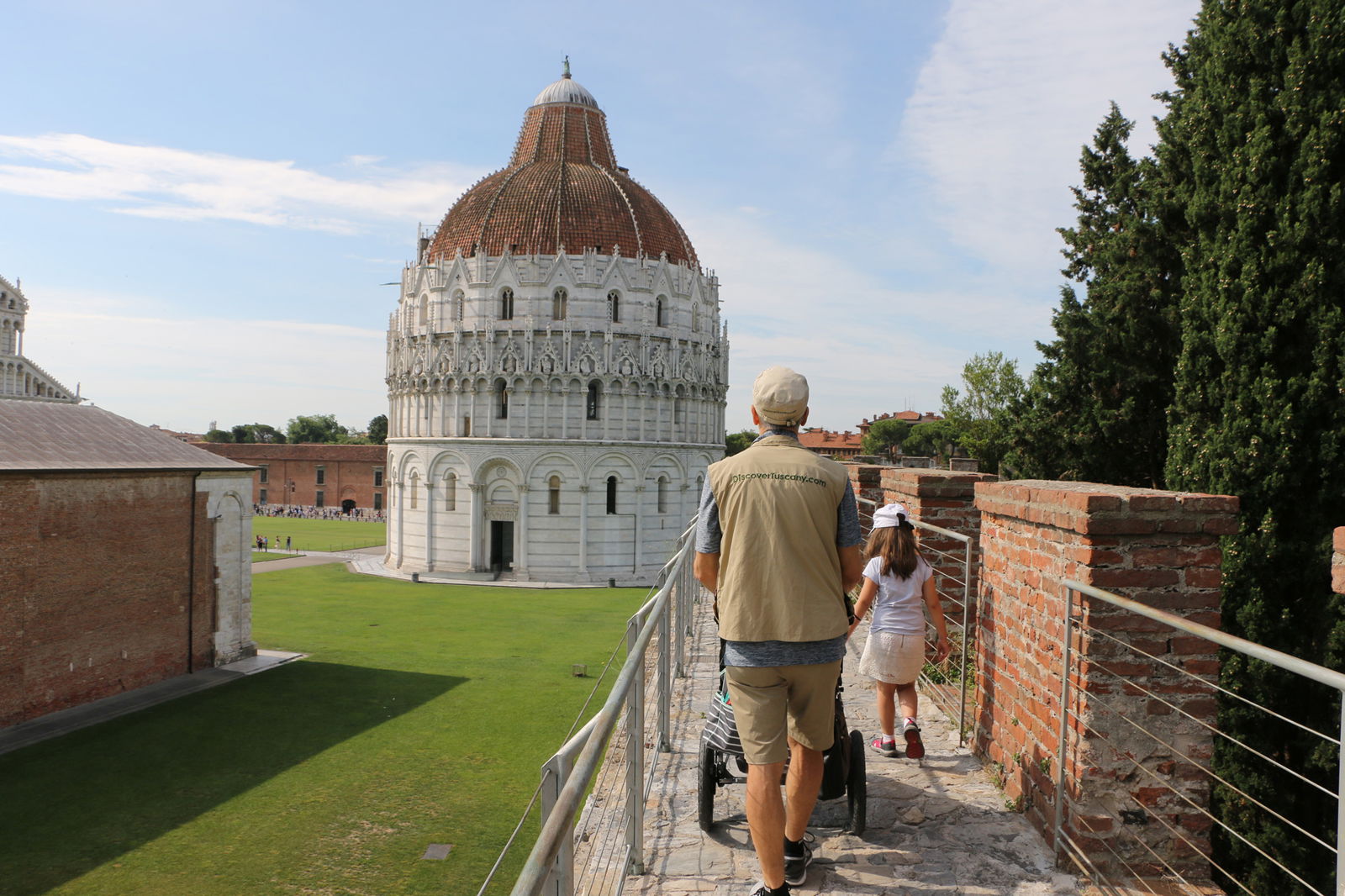 Our very own DiscoverTuscany family exploring Pisa; in the photo above, the newly opened walkway along the walls that surround most of Pisa from which you can enjoy a great view of Piazza dei Miracoli.