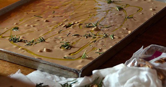 This dish, called castagnaccio, definitely has its roots in what many call “cucina povera,” the poor man’s kitchen. Made from chestnuts which have been dried and then ground down into a fine powder, a pinch of salt, water and olive oil. The mixture is a rather liquidy batter - almost like buttermilk (kind of thick but not too thick) - poured out to form a very, very thin layer on a baking sheet and then sprinkled with rosemary (absolutely) and to your descretion nuts and raisins. (The batter is laid out so thin that the nuts and raisins stick out even if they have sank to the bottom.)
